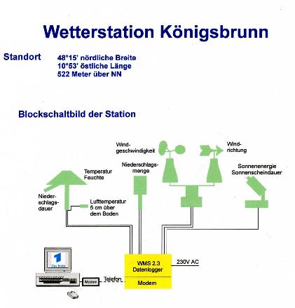 Die Wetterstation Königsbrunn im Mercator-Forum Die Wetterstation Königsbrunn wurde am 30. November 2001 in Betrieb genommen. Sie wird von der Mercator-Forschungsgruppe e.V. betrieben und steht im Gewerbegebiet Königsbrunn-Süd, auf dem Gelände des Mercator-Forums, Zeppelinstr. 7. Die Wetterstation Königsbrunn zeichnet im Minutentakt alle Wetterveränderungen auf. Die Daten werden im Stundentakt automatisch an die Webseite www.koenigsbrunn.de weitergeleitet, wo sie von jedermann eingesehen werden können. |